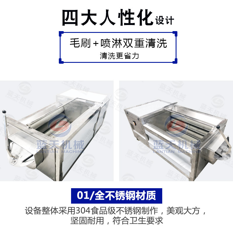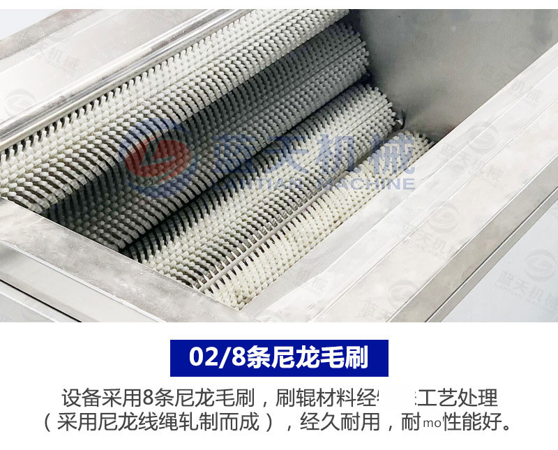 山藥搓光條機采用SUS304不銹鋼制做,設備上部有高壓噴淋對山藥表面進行沖洗可有效的洗去表面粘有的泥沙、中間有毛輥,通過毛輥的轉動帶動山藥的前進,并對山藥的表面進行刷洗可深層清洗山藥表面粘連的不易沖洗的雜物,毛輥采用雙層毛刷可以將表面的毛發和纖維物的清除。經山藥搓光條機去除纖維雜物后,提高了山藥的潔凈率。下部可進行水收集使之能循環利用,節約了成本。