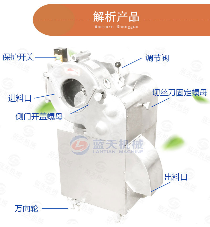 除了進料口、出料口外,還有其他位置的部件與物料切出的形狀質量息息相關,我們要熟悉一下:調節閥、切絲刀固定螺母、側門開蓋螺母,保護開關。保護開關提高了山藥片機器操作的安全性。切山藥機底部安裝的有萬向輪,方便移動。
